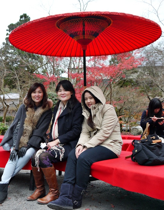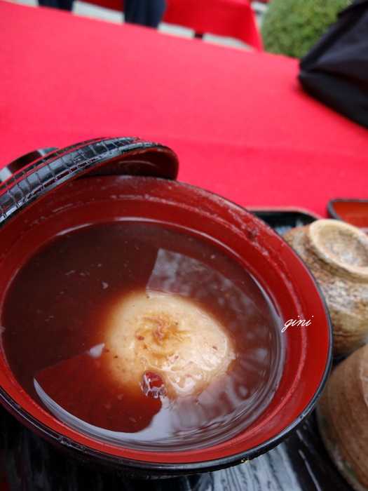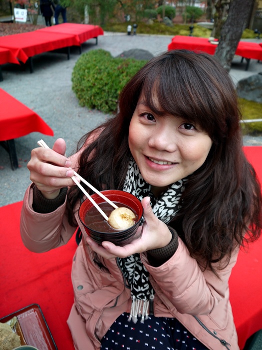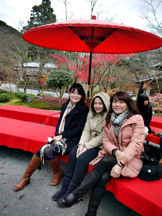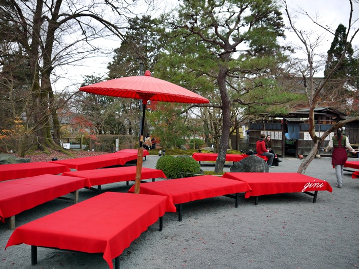 且大紅傘大紅鋪布的露天座,感覺好喜氣~ 是為了在紅葉時期不輸給楓葉紅嗎?!